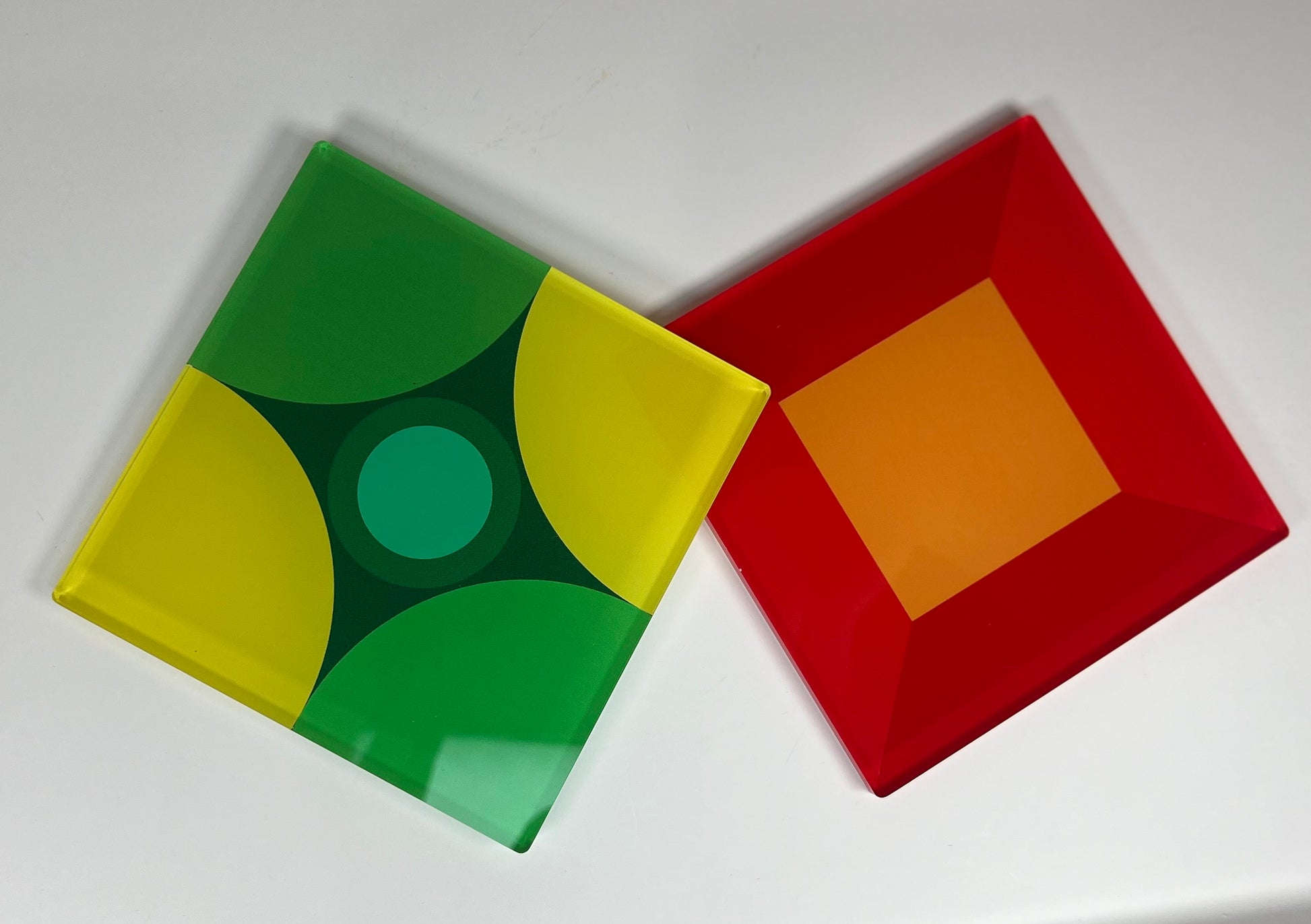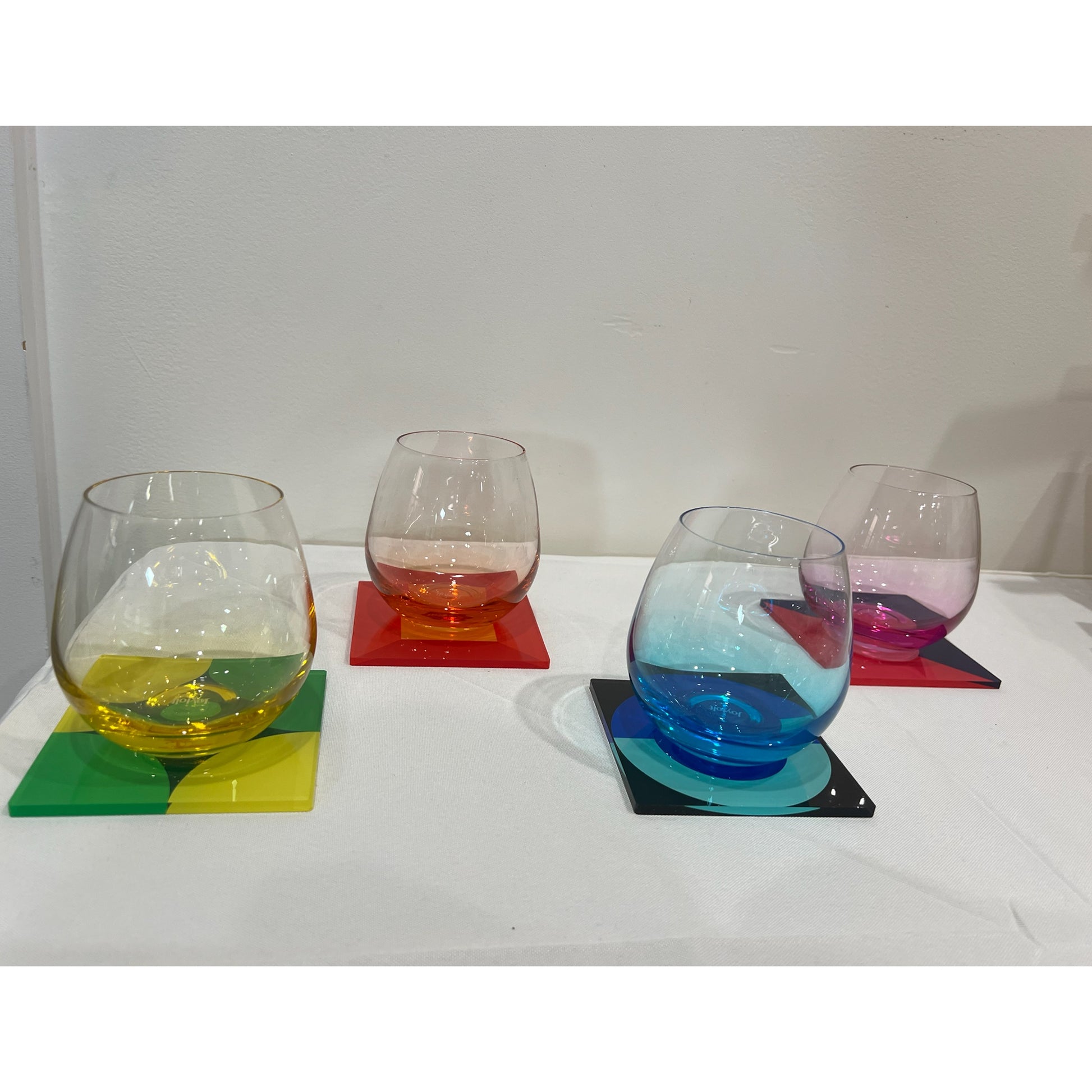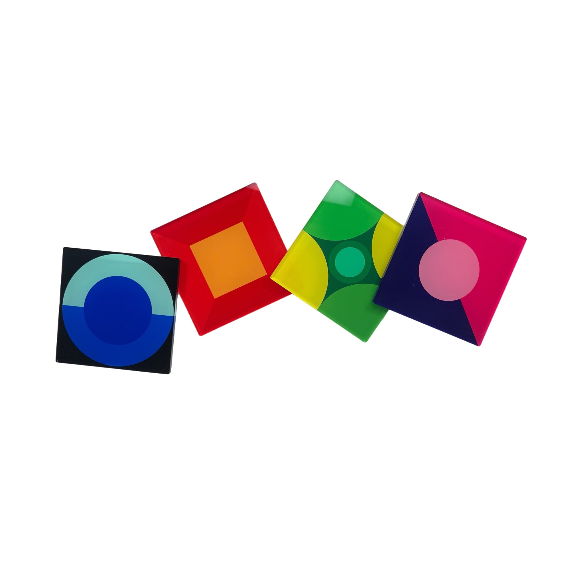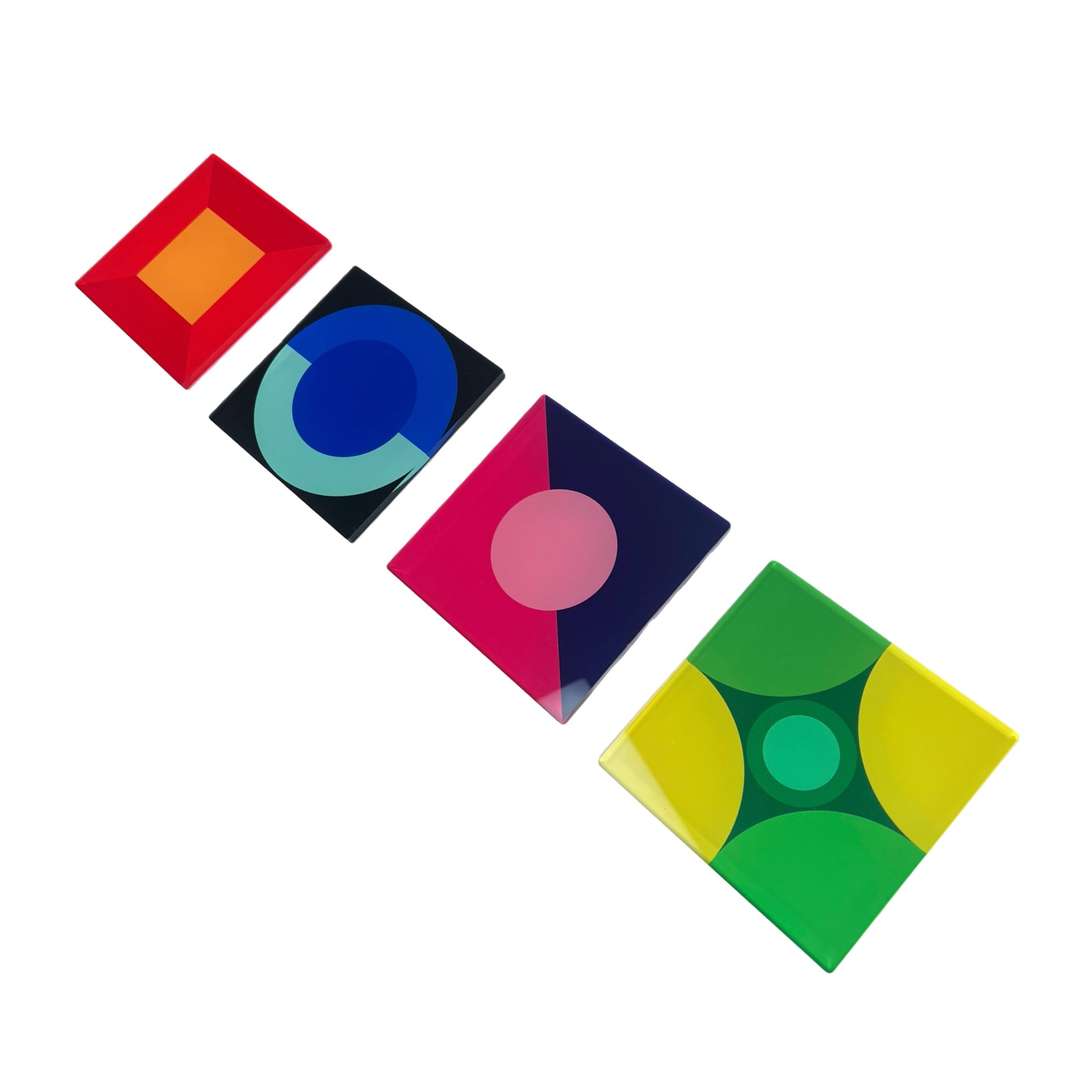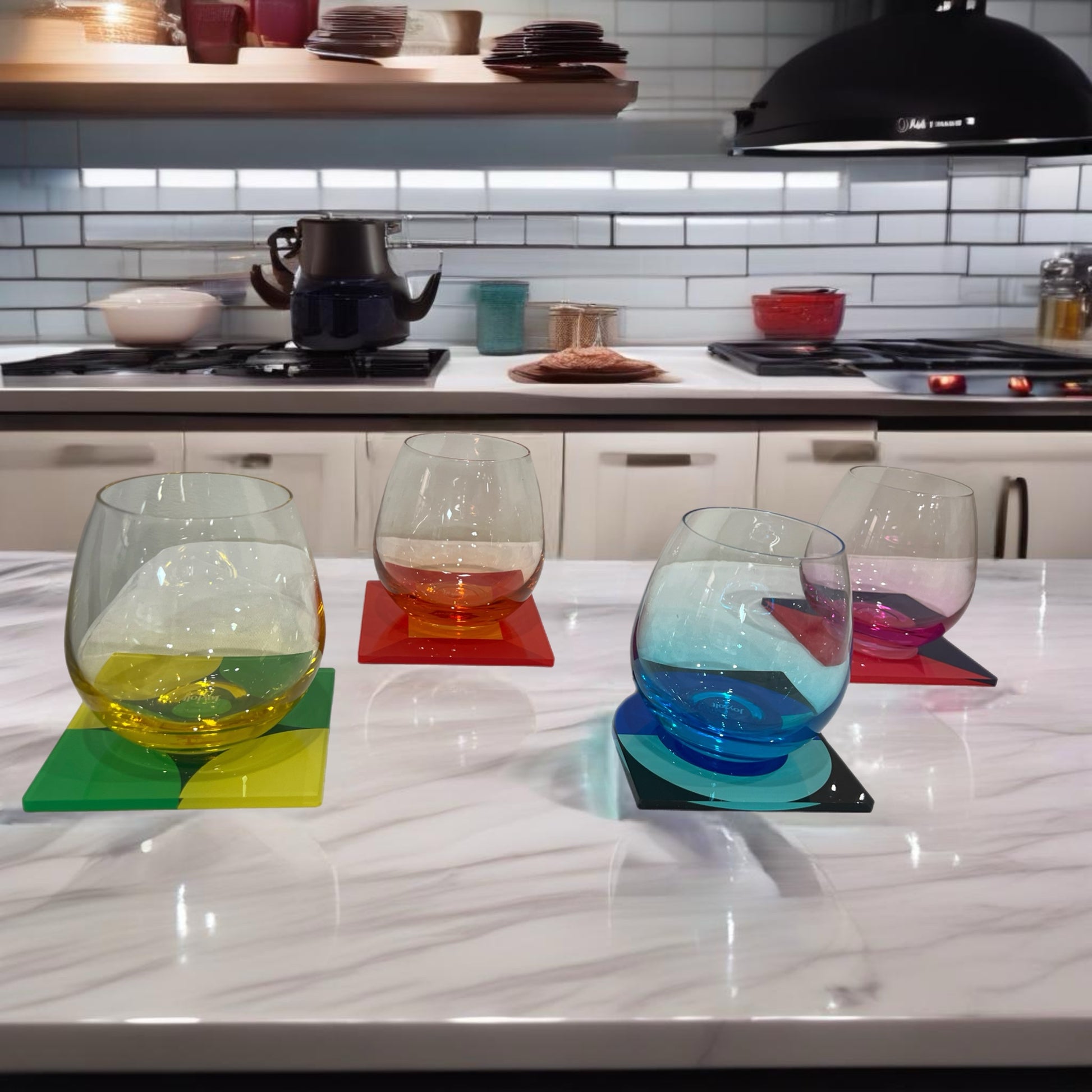 Made from high quality acrylic, these coasters are built to last and withstand everyday use. Each piece is work of art, combining bright colors and geometric shapes for a contemporary look.