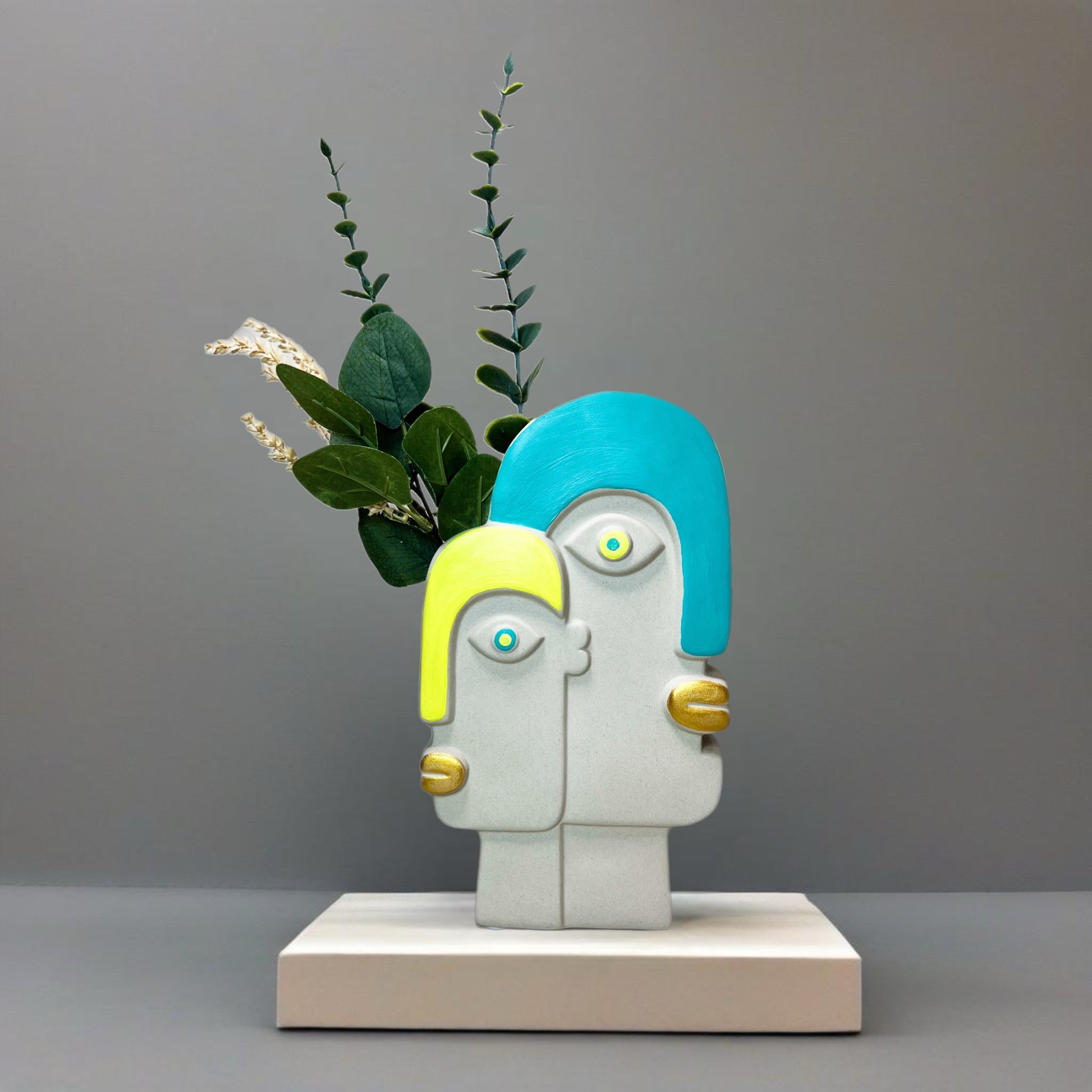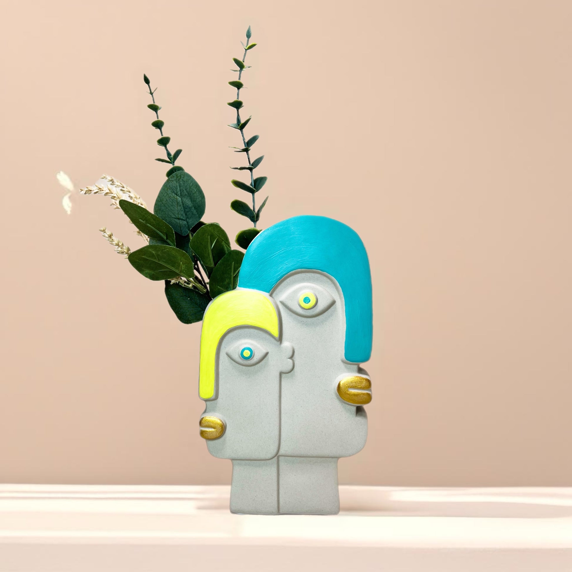 Each intricate detail, from the bold, vibrant colors to the expresisive faces, is meticulously painted by hand, ensuring no two pieces are exactly alike. Its modern shape, paired with artistic craftmanship, makes this vase a statement piece for any space.