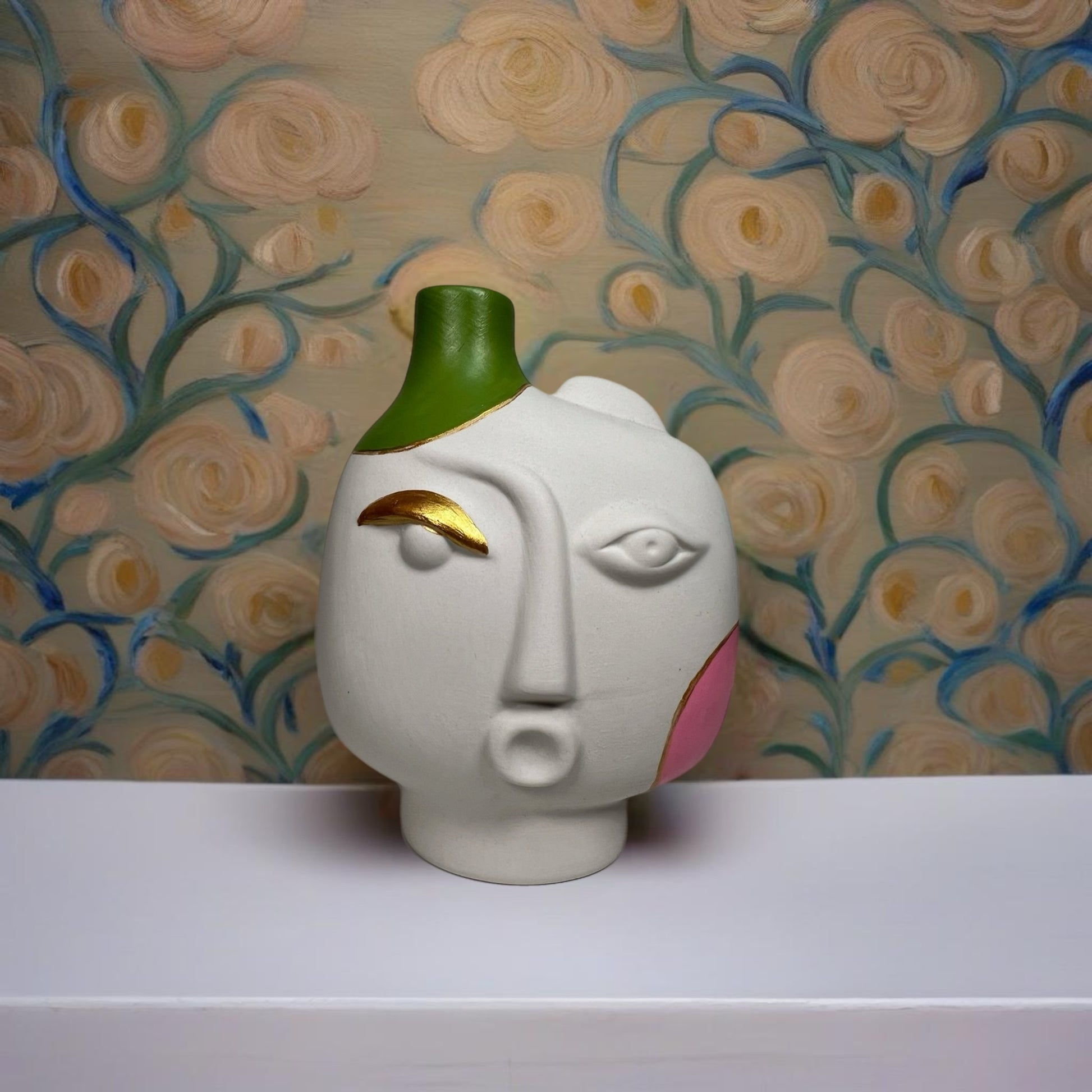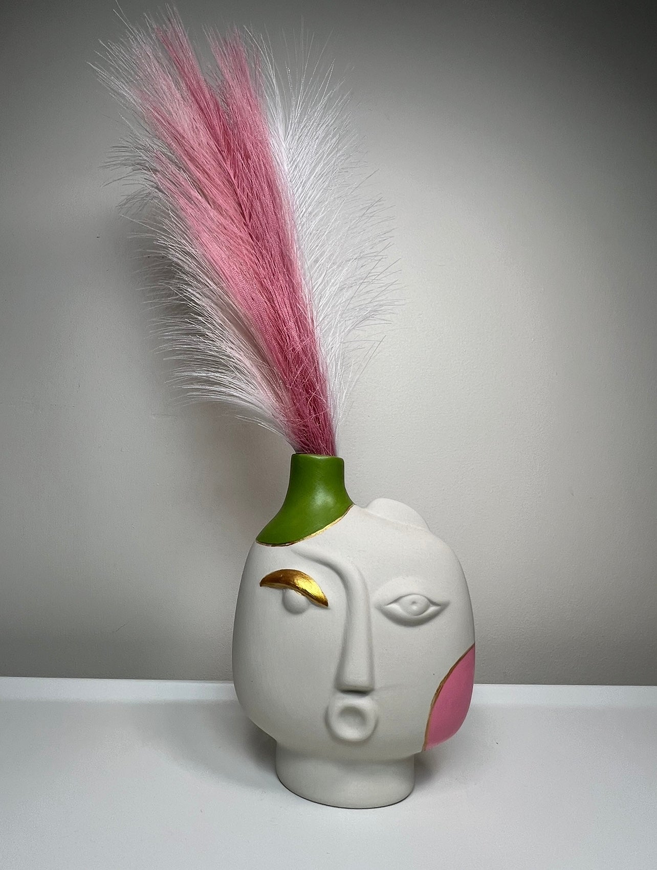 Each brushstroke is carefully applied, ensuring that no two vases are exactly alike. The combination of soft pinks, earthy greens, and luxurious gold accents brings an elegant yet playful vibe to your decor. Whether displayed on a shelf, table, or mantle, this vase will become a conversation piece and a cherished item in your collection.